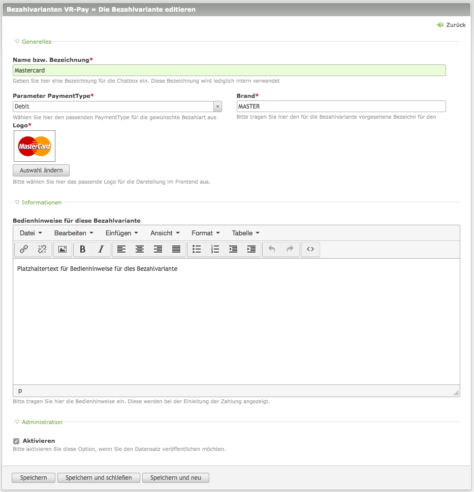 | Bedienhinweise für diese Bezahlvariante | Hier können Sie optional einen Hinweistext für die Anzeige im Frontend hinterlegen. Diese Text wird angezeigt, wenn der Spender sich für eine Variante entschieden hat. |