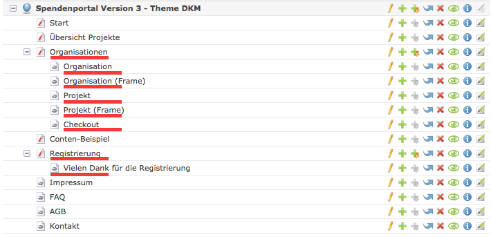 Nachstehend sehen Sie eine beispielhafte Struktur für das Theme 1. Die "rot" markierten Seiten sind die erforderlichen Seiten für das Spendenportal.