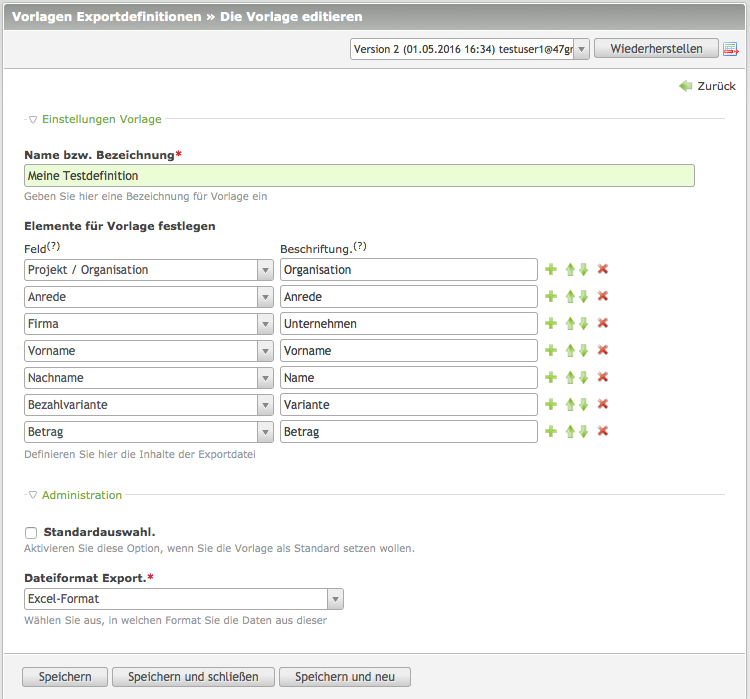 | Elemente für die Vorlage festlegen | Hier können Sie die gewünschten Werte Zeile für Zeile im Bereich "Feld" auswählen, und bei "Beschriftung" können Sie eine entsprechende Überschrift für diese Exportspalte benennen |
